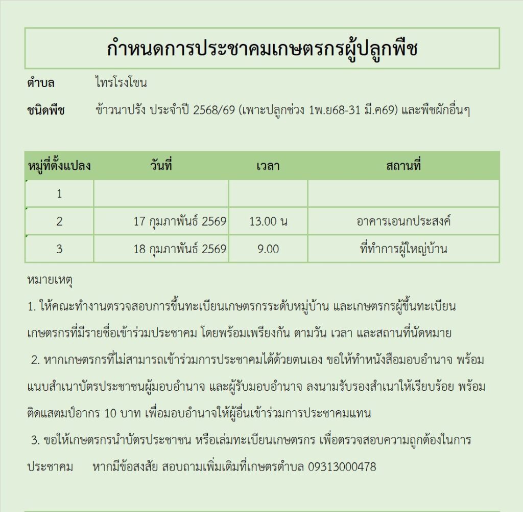 ประชาสัมพันธ์นัดหมายการประชาคมเกษตรกรผู้ขึ้นทะเบียนเกษตรกร ปี 2569 ตำบลไทรโรงโขนBy taphanhin / 13 กุมภาพันธ์ 2026 นัดหมายการประชาคมการขึ้นทะเบียนและปรับปรุงทะเบียนเกษตรกร พืชเศรษฐกิจ (นาปรัง) ปี 2568/69 ชะอม ข้าวโพด และพืชอื่นๆ ตำบลไผ่หลวง