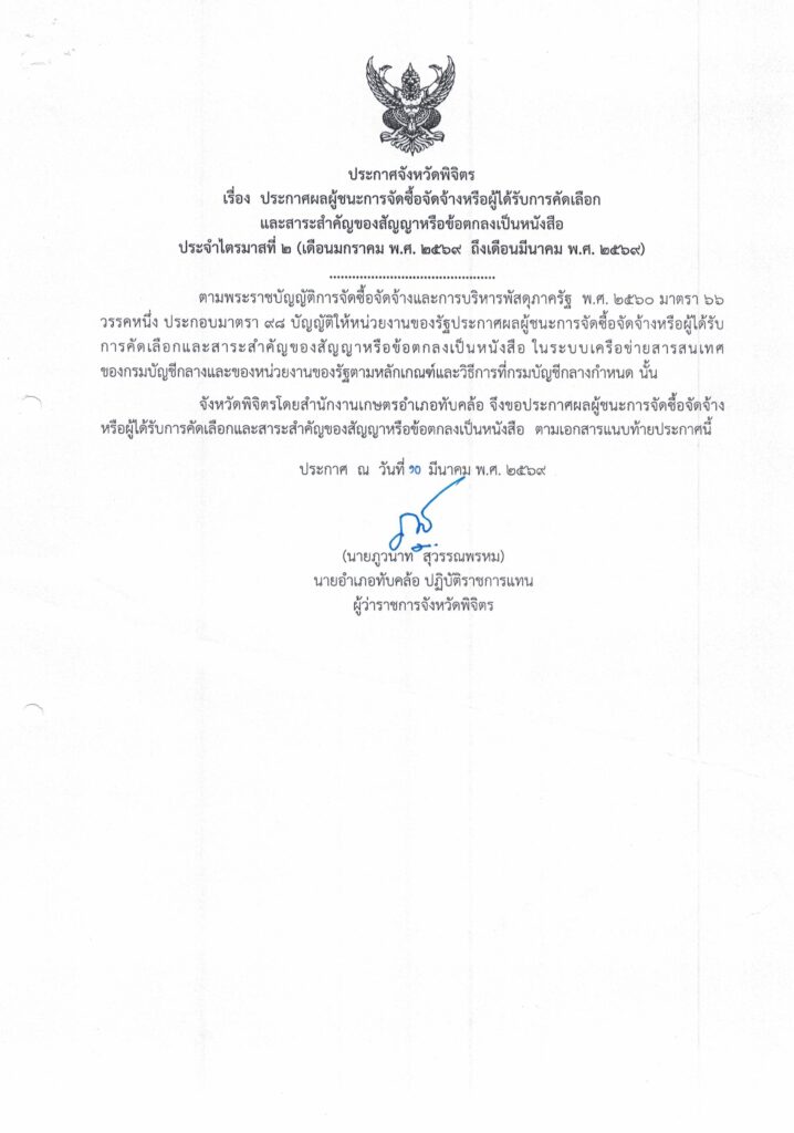ข่าวการจัดซื้อจัดจ้างประกาศจังหวัดพิจิตร เรื่อง ประกาศผลผู้ชนะการจัดซื้อจัดจ้างหรือผู้ได้รับการคัดเลือกและสาระสำคัญของสัญญาหรือข้อตกลงเป็นหนังสือ ประจำไตรมาสที่ 2 (เดือนมกราคม พ.ศ.2569 ถึงเดือนมีนาคม พ.ศ.2569 tapkhlo / 13 มีนาคม 2026